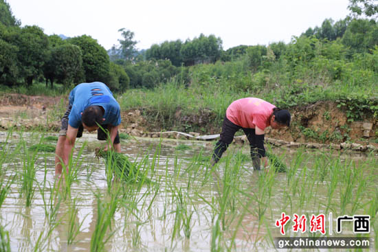 夏日,在广西荔浦市修仁镇福旺村大寨屯,今年政府部门修通一条灌溉沟渠通水后,村民们积极行动起来,重新复耕昔日茅草丛生的近40亩撂荒耕地,赶在夏至前种上水稻谷,守住“藏粮于地”初心。