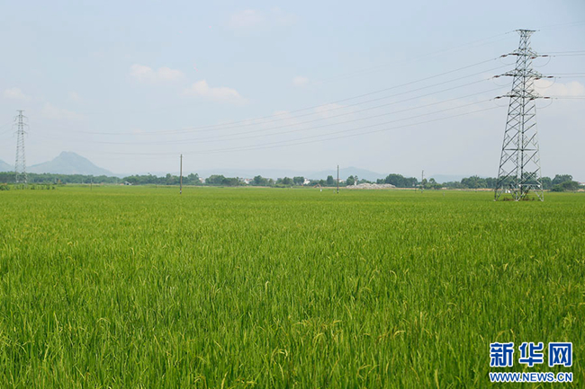 水稻示范基地里绿油油的稻浪阵阵。新华网 蒋颖 摄