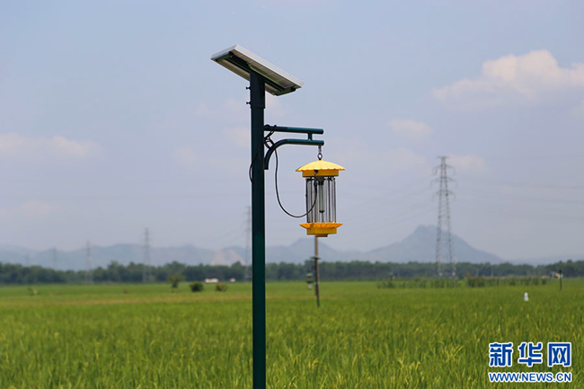 水稻示范基地的太阳能诱捕杀虫灯。新华网 蒋颖 摄