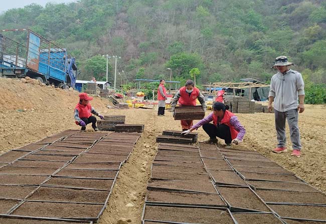 日前,在西林县那劳镇那劳村的育秧田里,西林榕门农业服务农民专业合作社社长农凤华正带领服务队在进行机械化育秧,只见育秧流水线一次性完成铺土、洒水、播种、覆土、盘输出等工序,3个多小时,已经完成育秧2400盘,服务队员们将秧盘整齐摆放到育秧田里,再覆盖遮阳网、浇水,每道工序有条不紊地进行着,很快就完成了120亩水稻的育秧工作。