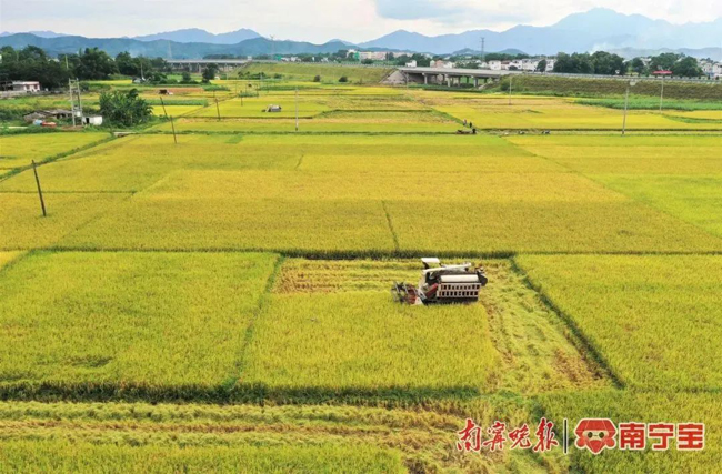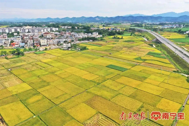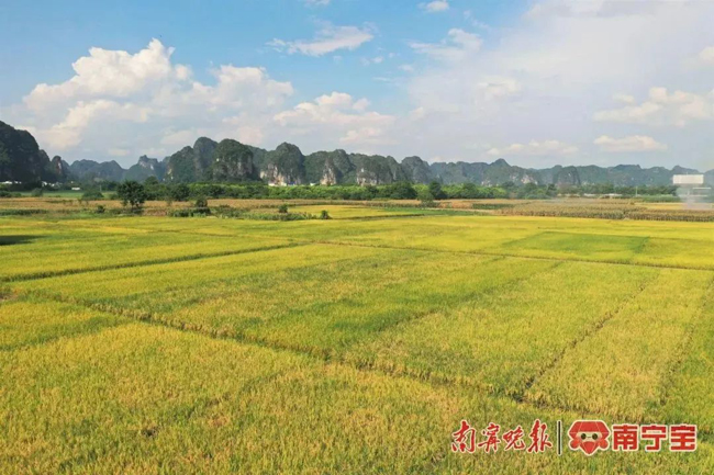 七月的田野,遍地金黄。近日,记者在南宁市上林县澄泰乡漫桥村大鸡庄周边稻田里,看到颗颗饱满的稻穗被压弯了腰。一望无际的稻田里,一幅金黄色的丰收画卷缓缓铺开。