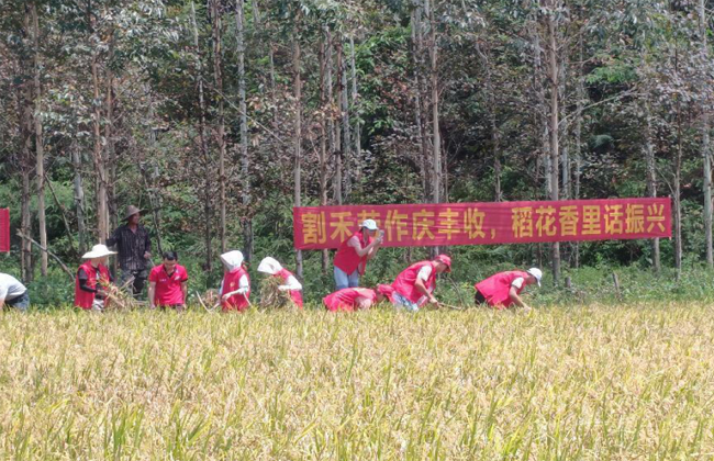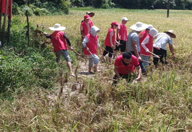 ▲茅岭镇政府组织镇村干部及志愿者助力水稻收割。