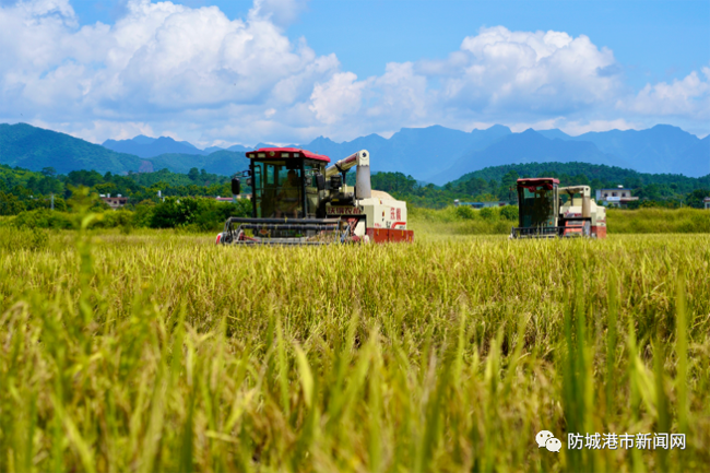 时值盛夏,记者走进防城区那良镇其那村近800亩的水稻种植基地,只见黄澄澄的稻浪随风摇曳,两台大型收割机伴随着轰鸣声在农田里来回忙碌着,水稻被迅速收割,经过脱粒后装载到路边的农用车里。