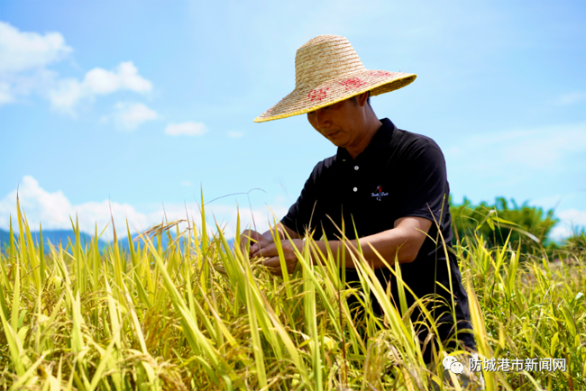 防城区心远种养专业合作社理事长何深达现场查看稻谷的饱满度。
