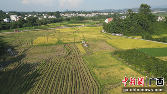 临近入秋,广西荔浦市约12万亩水稻抢收接近尾声,早稻丰收成定局。近日,当地合作社、农民正抢抓晴好天气,请来收割机进行抢收,确保粮食颗粒归仓入库。