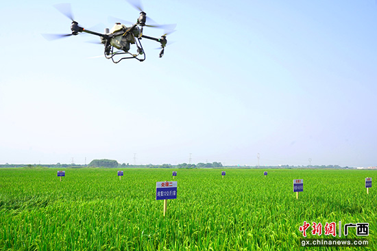 眼下正值水稻生长的关键期,近日,走进广西贵港市港北区庆丰镇河龙村的水稻田中,只见专业操控手熟练地操控着装满混合肥药剂的无人机,在稻田上空来回穿梭,将雾状的农药和肥料均匀地洒落在水稻叶面上。