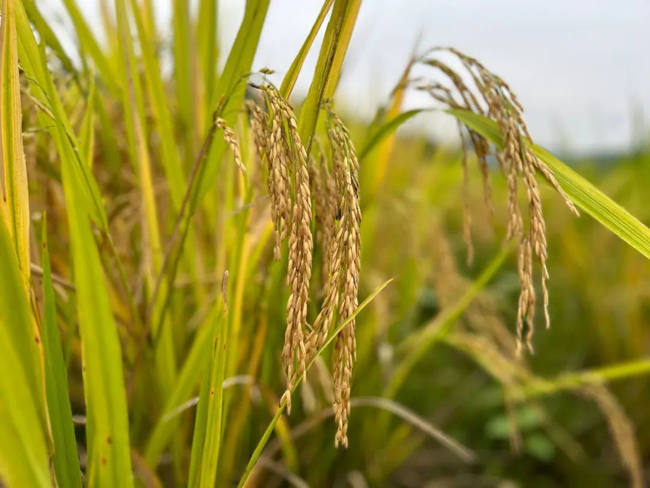 (图为:沉甸甸的稻谷把稻穗压弯了腰)