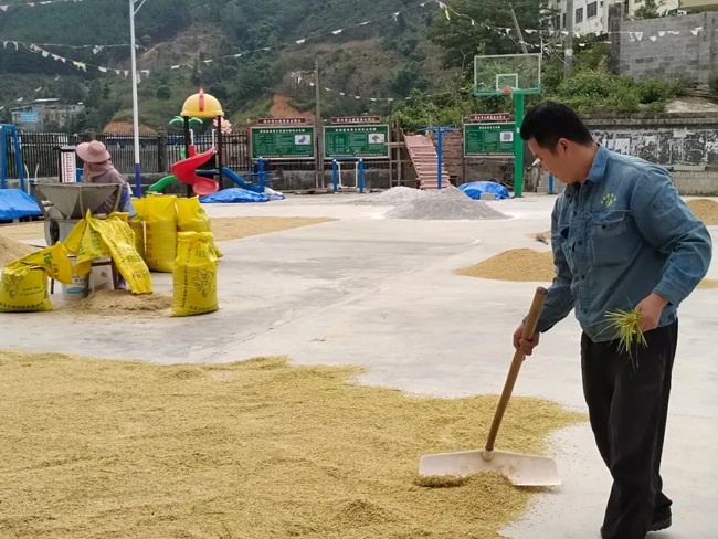 在晾晒现场,收割结束的农户纷纷利用晴好天气,将稻谷拿到晾晒场、篮球场等空地上晾晒,空地上被金黄色的稻谷铺满,在阳光下,村民们手拿塑料耙子,将稻谷薄厚均匀铺开。“这段时间天气很好,借着村部这么宽的场地,我们家的水稻二三天就能晒干。”村民黄大哥说。