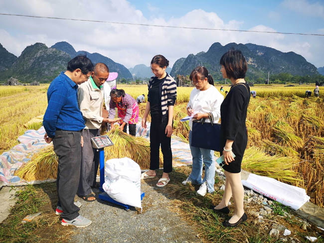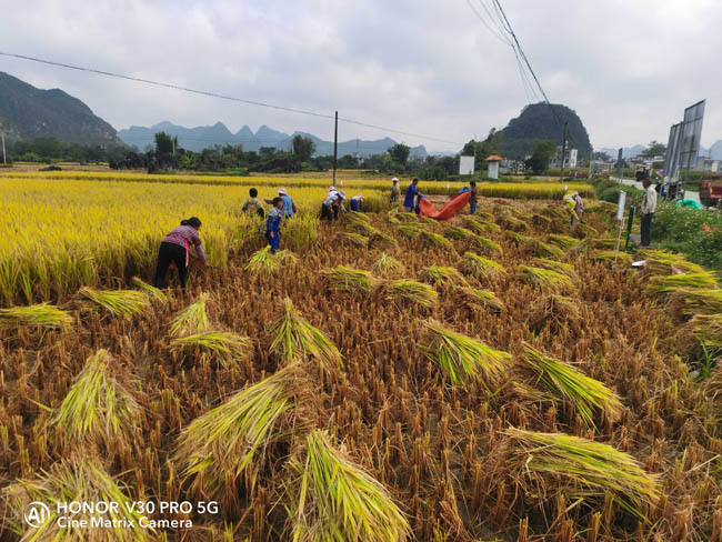 2023年天等县基层农技推广体系改革与建设补助项目“晚稻富硒有机化种植示范基地”400亩晚稻开镰收割,该基地按照统一种植品种、统一肥水管理、统一技术指导、统一病虫防治、统一机械收获的 “五统一”要求,因地制宜,良种良法和农机农艺有机结合,集成主推以下技术:示范推广优良品种、集成应用高产技术、加强病虫害绿色防控技术、增施有机肥和测土配方施肥、推进机械化生产;10月30日,天等县农业农村局组织技术人员进行验收产量,平均亩产500公斤以上,比我县其他稻期产量高每亩100公斤左右,由于种植的是优质品种、使用有机肥种植,稻谷品质优,该村种植的富硒大米已全部由广西天等县香中农业有限公司高于市场价收购完成。