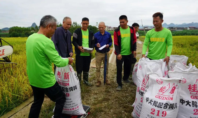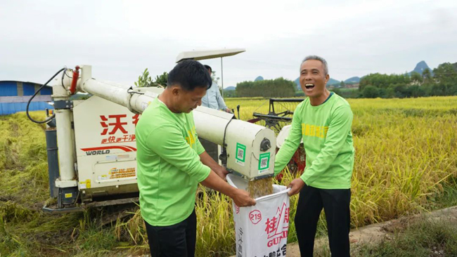 在现场,收割机将脱粒后的稻子装入袋中,进行测产。经过称重,每亩达1200斤。广西金瑞土地整治开发有限公司副总经理廖明立表示,今后把这个项目管护好、维护好,为乡村振兴做出应有贡献。