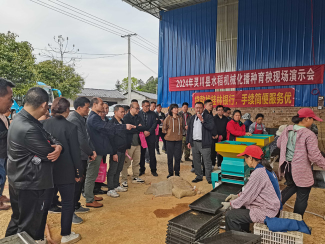为进一步提升水稻综合生产能力,确保粮食安全,推动农业高质量发展,3月26日,灵川县农机中心在潭下镇大泉村委郭田村召开2024年灵川水稻机械化播种育秧技术培训现场演示会,参加培训的有县农业农村局、潭下镇政府相关领导及农机技术人员,三街、定江等8个乡镇农机工作负责人、科技示范推广主体及种粮大户等共计50余人。