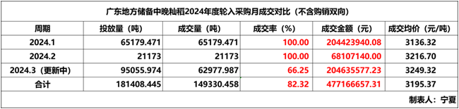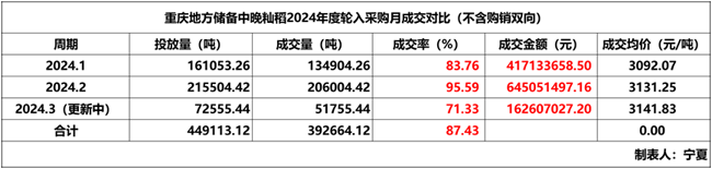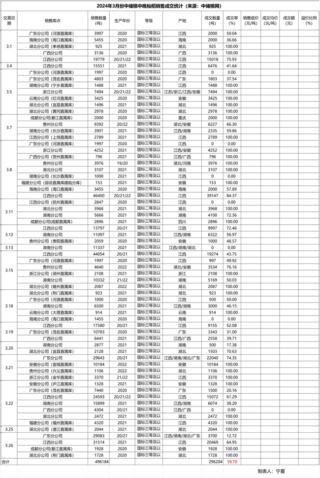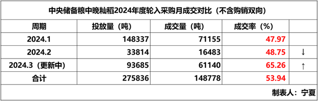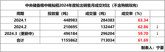 从下方2024年中央储备粮中晚籼稻轮出销售(不含购销双向)的成交对比统计图表和3月份的统计明细图表上,我们可以看到除2月份春节假期因素之外,1月份和3月份的轮出销售数量都是40万吨以上级别的,而3月份的轮出销售数量则基本可以确定超过50万吨,进入3月份后成交率已出现了下跌的势头。同时3月下旬后,架空期相对宽裕的主销区地方储备中晚籼稻轮出销售的数量也在不断增加中。这意味随着稻谷市场供应面的增加,需求面不说疲弱,即便是保持稳定,中晚籼稻市场的供需环境也将会得到改变,这将对稻谷上涨的势头构成一定的压制作用。