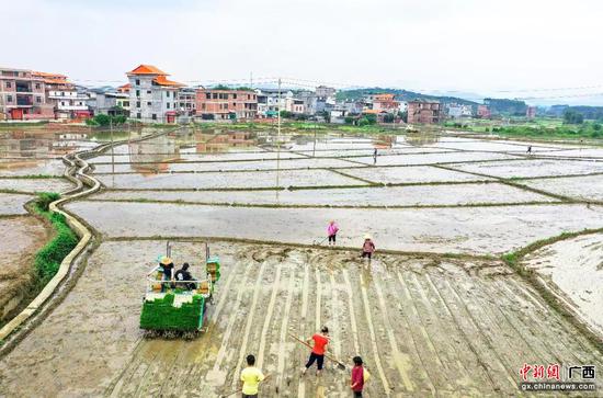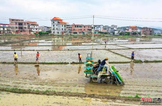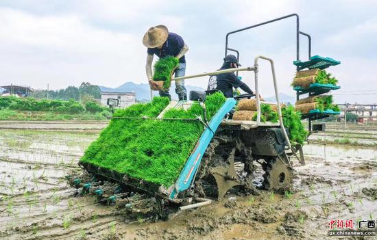 4月2日,在广西梧州市苍梧县沙头镇新建村,农机手正在驾驶插秧机插早稻秧苗,抢抓农时。清明时节,春暖气温升,广西梧州市及时引导农民、种粮大户及时掌握晴暖天气栽插早稻苗,全市种植早稻可望超80万亩。