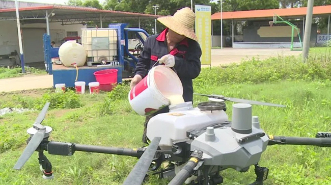 近日,记者来到中华镇老上卢村水稻种植区看到,工作人员将调配好的药剂倒入无人机药箱中。紧接着,伴随着螺旋桨的嗡鸣声,一架载满农药的无人机在技术人员的遥控下,匀速沿着稻田飞行,机身下方喷洒出超低容量雾化农药,均匀洒向田间水稻的叶片和茎基部,勾勒出一幅抢抓农时忙生产的劳动景象。