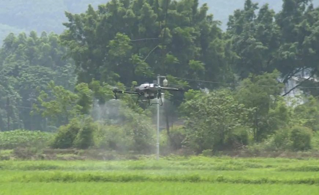 眼下,正值水稻春管关键期,在宾阳县中华镇水稻种植片区,宾阳联丰农机服务农民专业合作社农机技术人员正抢抓时机,使用植保无人机开展水稻病虫害防治,通过科技手段助力田间管理,确保水稻增产增收,赋能农业生产提质增效。