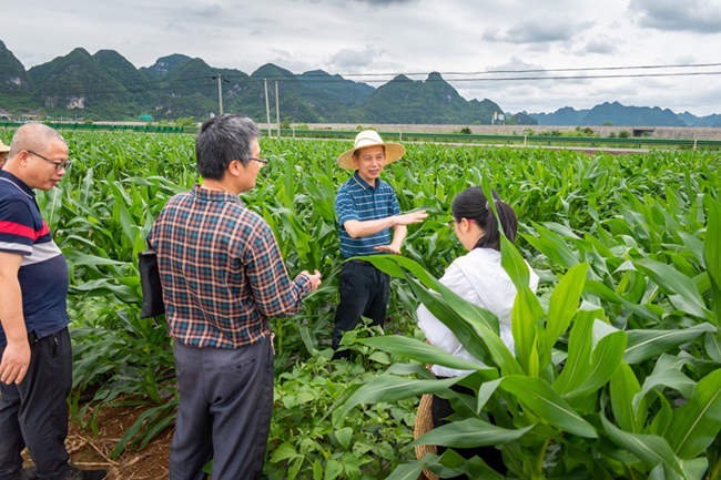 在武鸣锣圩镇旱作场调研指导大豆玉米带状复合种植