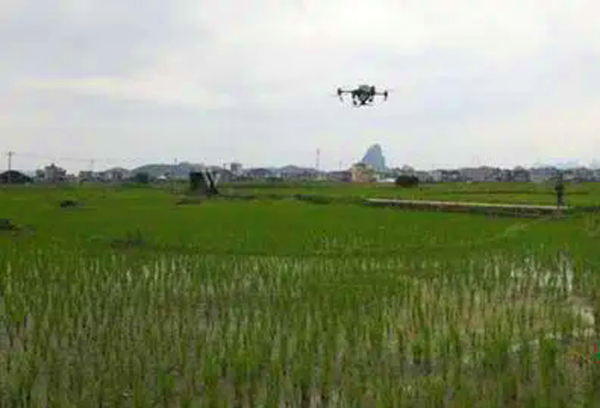 技术员正通过手机操纵飞防植保无人机进行稻田管护工作。