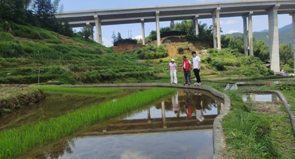 2024年5月23日上午,乡村科特派员、九溪村协理员及村委会干部,一同深入田间地头观察秧苗生长情况及病虫发展状况。