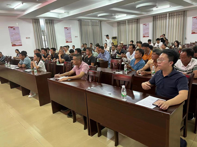 5月24日上午,北海市农业技术服务中心在合浦县农业农村局开展水稻增密增穗技术和水稻病虫害防治技术培训,60名种植大户正在认真地聆听老师的讲解。