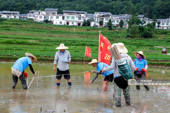 活动中,20多名志愿者分成4个小组穿梭在田间,按照稻田画设计图查找坐标、插旗定位、丈量定点、插杆定桩,用红线勾勒出稻田画的轮廓后,指导当地群众将不同颜色的彩色稻秧苗栽种到勾勒的稻田画中。大家不惧日晒雨淋、团结奋战,经过8天的连续作业,终于完成了“农业强国”巨幅稻田画的制作。