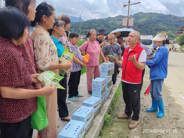 图:县植保经作站技术人员免费向群众发放水稻病虫害防治物资