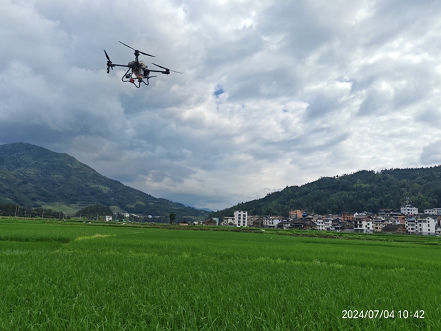 图:用无人机在水稻病虫害绿色防控集成示范区投放蜂球放蜂器