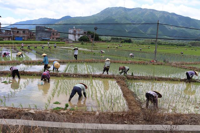 小暑时节,在钟山县两安瑶族乡沙坪村、莲花村和红花镇俄柳村、古楼村、桃加村、洞心村、红花村、龙燕村连片的思勤江流域杂交水稻制种示范带,群众在广袤田野一边忙着早造杂交水稻制种喷药、赶花,一边忙着晚造杂交水稻播种、起秧和移栽大田,呈现一幅繁忙的农耕壮美画卷。