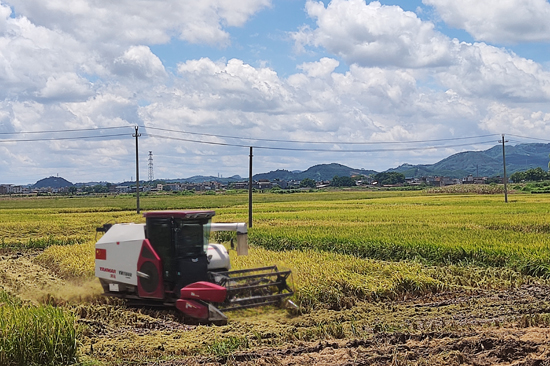 在上塘村委下塘村的水稻田里,收割机轰隆作响,穿梭于一片金黄稻野之间,饱满的稻穗不停地被吸入机器的“肚中”,割穗、脱粒、排草、筛选等工序一气呵成;田埂上运粮的货车、小斗车满载稻谷满载而归,大伙虽然忙得汗流浃背、不可开交,但是收获的喜悦溢于言表。