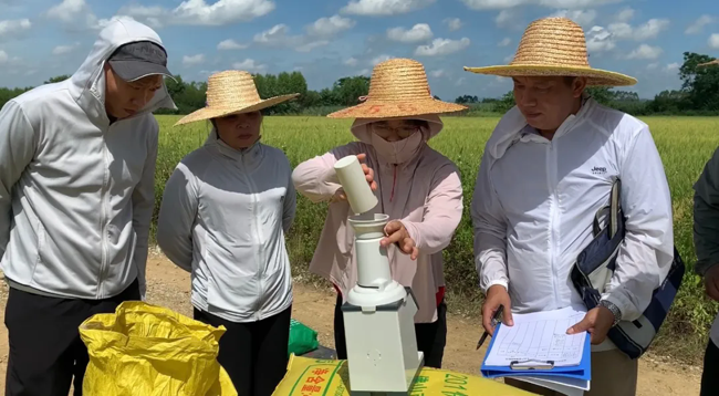 7月23日,兴宾区农业农村局联合农技专家到大湾镇密屋村委古柳村水稻增密增穗高产攻关示范片进行水稻现场测产工作。农技专家们遵循科学、规范、客观的原则,严格按照验收方法步骤,科学选择有代表性的地块,通过机械收割、脱粒、称重、装袋保管等环节进行实际测产。该示范区水稻种植面积有600亩,主推30×14、30×12、30×16三个密度,经测算,平均亩产510公斤,最高亩产达551.7公斤,单产提升效果显著,为全区粮食稳产增收起到了很好的示范作用。