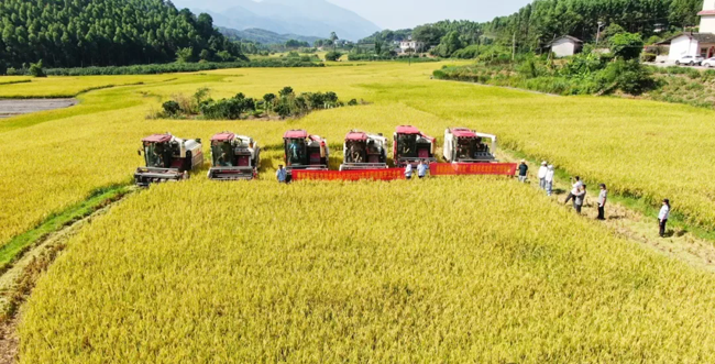 龙虎乡龙岭村的早稻种植基地正在机械化抢收早稻。