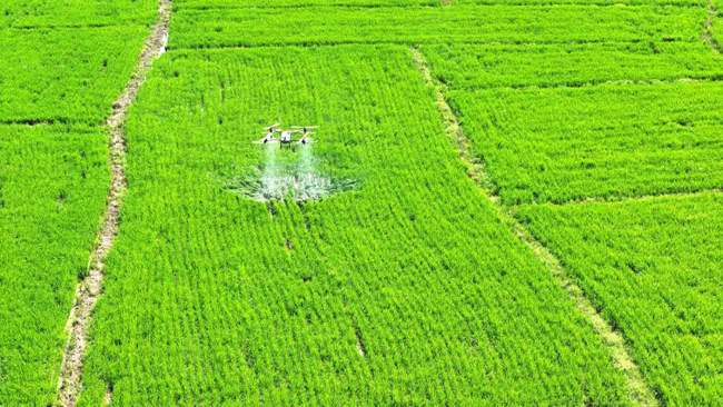 “现在是水稻预防虫害的关键时候,我们今天早上六点多就开始作业了,一台无人机一天能完成四百到五百亩。使用无人机作业,水稻受药比较均匀,农民也可以节约成本。”无人机飞防技术人员韦德悦说。