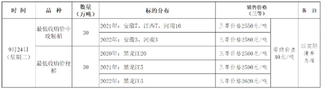 下周9月24日最低收购价稻谷竞价销售交易公告