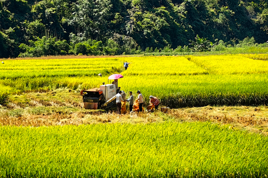 农户们用现代化收割机在收割秋稻。周俊位摄