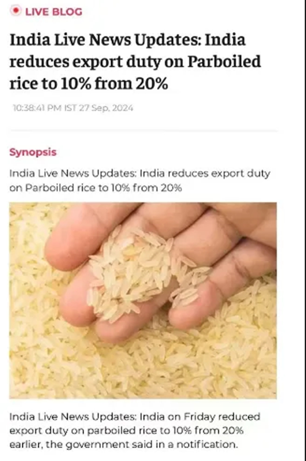 印度财政部周五宣布,将蒸谷米的出口关税税率从20%下调至10%。