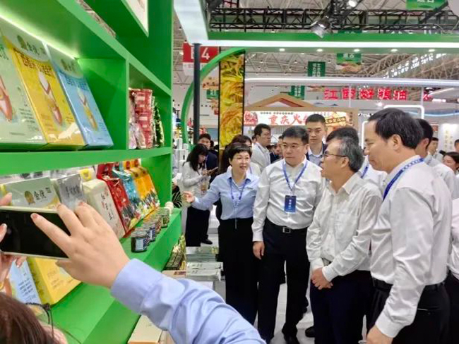国家粮食和物资储备局党组成员、副局长刘小南(右二)视察广西粮油展区,自治区粮食和物资储备局党组成员、副局长,二级巡视员李国平(右一)进行介绍(苗阅明 摄)