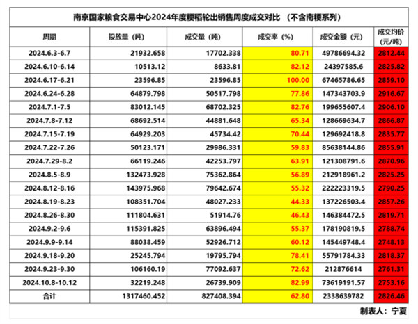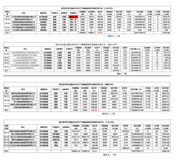 从以上几张统计图表上,我们可以也明确看到不仅中晚籼稻市场价格进入企稳回涨态势,同时江苏市场的政策性储备粳稻成交均价回落幅度也有所收缩,但成交率却是大幅上升,这也意味着面对着新季粳稻的品质差强人意的现实情况,粳稻市场价格同样会出现企稳并小幅上涨。结合某储备企业7000吨2024产季粳稻反复流拍后,最终实际成交净价2820元/吨来看,品质类新作粳稻高开也基本成为定局。