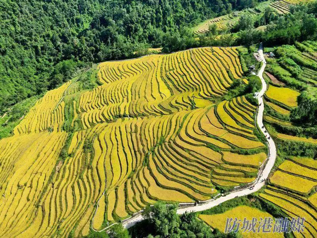 近年来,百马屯大力推进粮食产业发展,在梯田种植200多亩水稻,一到秋收时节,如诗如画的梯田景观和独特的瑶族风情吸引八方游客前来。