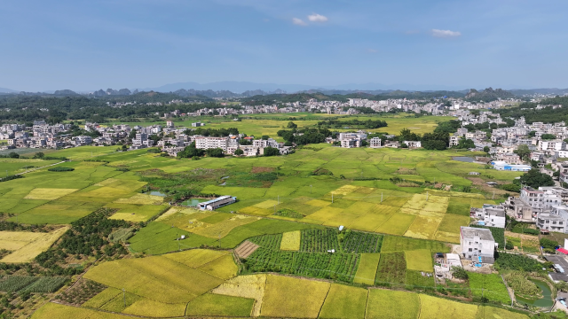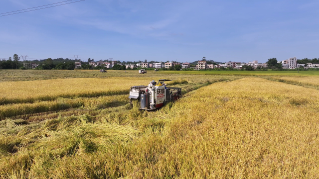 金秋时节,大地一片金黄,处处洋溢着丰收的喜悦!广西陆川县平乐镇六凤村,上千亩良田稻浪翻滚,农民抢抓晴好天气,在田间地头辛勤劳作,开展秋收工作,确保秋粮颗粒归仓。