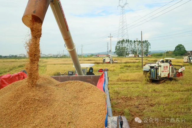 东兴市福珍水稻种植专业合作社负责人刘福珍说:“今天的天气很不错,有利于水稻的收割,我们出动了5台收割机,加足马力采收,这250亩水稻大概二天就全部收割完毕,剩下来1650多亩,大概20天就可以收割完毕,预计每亩水稻产量800斤左右。”