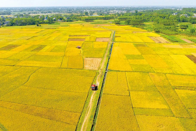 农机手驾驶收割机抢收应用增密增穗技术的晚稻。