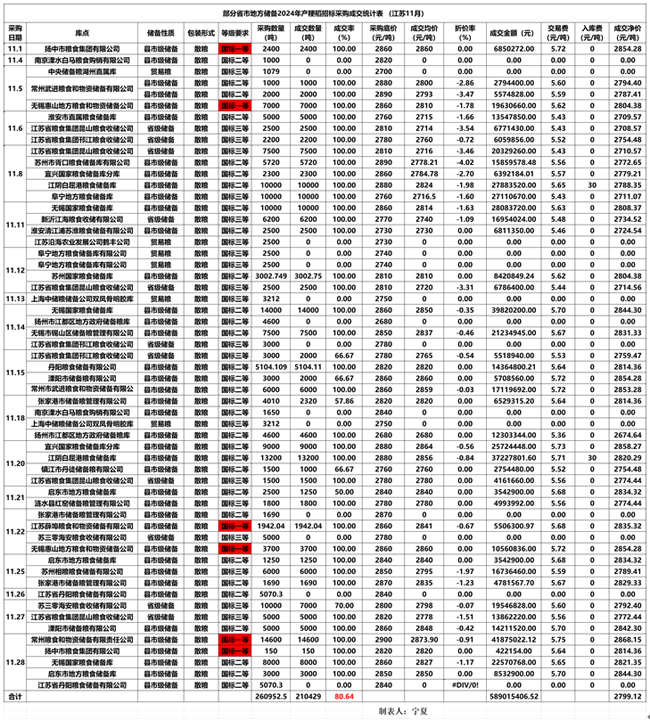 进入11月中下旬后,粳稻市场价格渐显强势,尤其是苏皖区域,多数政策性储备粳稻谷采购成交价都逼近或超过了2800元/吨,少数要求标准较高的标段甚至有接近2900元/吨的势头。我们从以下三张南京国家交易中心的2024年产粳稻采购成交明细及月度成交对比来看,11月份江苏市场粳稻采购数量为10月的四倍,成交率大幅提升的同时,成交均价却并沒有下滑,反而呈现前低后高量价配合的好势,那么这也意味着粳稻短线依然有继续上攻的趋势。