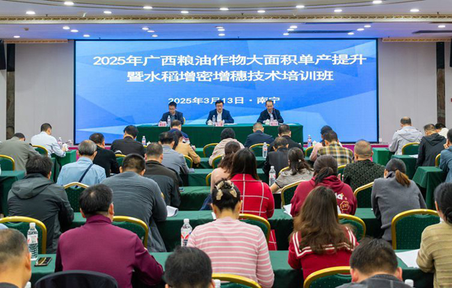 为进一步推进粮油作物大面积单产提升技术保障工作,加大力度示范推广水稻增密增穗提单产技术,助推2025年全区粮油生产目标任务全面完成,日前,2025年全区粮油作物大面积单产提升暨水稻增密增穗技术培训班在南宁举办,自治区农业农村厅副厅长、党组成员韦波出席并讲话。