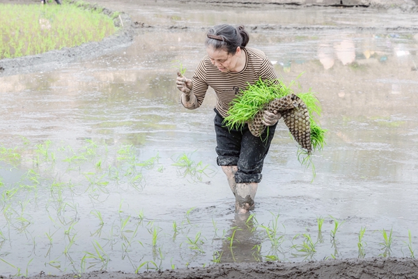 在稻田里,培育好的秧苗健壮而嫩绿,整齐排列。村民们抢抓农时,利用插秧、抛秧两种移栽方式,有条不紊地进行耙地、整地、插秧、施肥。他们弯腰弓背,左手持秧苗,右手插秧,动作干净利落,秧苗扎根沃土,片片农田披上了“绿装”,一幅充满韵味的春耕图景徐徐展开。