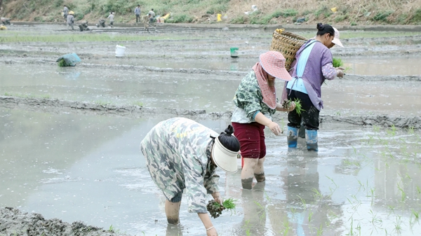 此次早稻春耕,西林县农业农村局科技特派员和基层农技员也深入田间地头,和农民群众一起耕种。他们不仅传授技术,还亲手示范,与农民们一起下田,确保秧苗都能茁壮成长。基层农技员王娜说:“这片水田是我们那劳镇可种植早晚稻的‘双季’水稻种植基地,眼下正值早稻插秧关键期,作为基层农技员,我们深入田间指导农户规范种植、科学管理,确保水稻种植获得稳产增收。”
