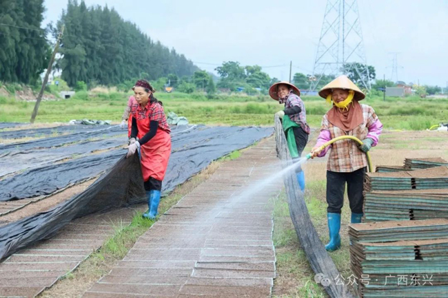与此同时,备耕地水满田畴,晚稻种植蓄势待发,育秧流水线马力全开,村民娴熟地配合育秧机摆盘、放土、喷淋、投稻种……一个个秧盘整齐摆放于苗床,陆续被浇淋、覆膜养护,为夏种备下“好苗头”。