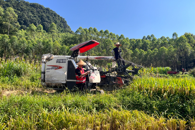“以前收割、打谷、装袋全靠人工,耗时又费力,现在有收割机帮忙,收一亩地只要十分钟,效率高多了。”土博镇梅里村水稻种植户韦忠说道。