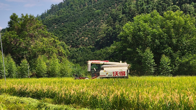 收割机开足马力穿梭在稻田间作业。王盛香 摄