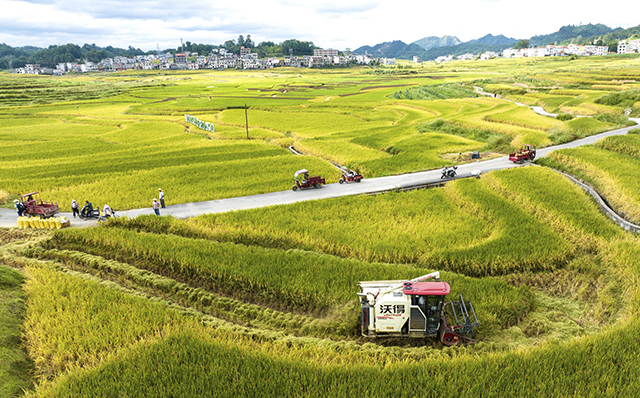 在位于南丹县芒场镇万亩巴平梯田的绿稻花海田园综合体水稻种植区,收割机在稻浪中穿梭,呈现出一幅繁忙的秋收图景。