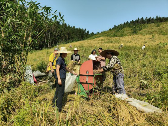 农户们借助脱粒机进行旱禾脱粒