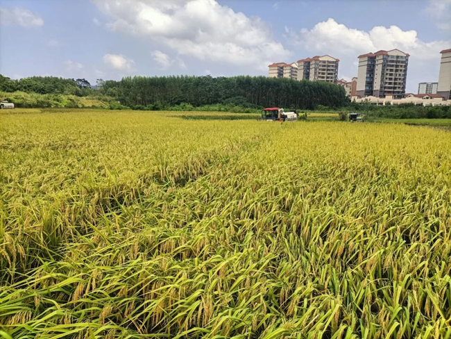 金秋十月,江南区吴圩镇吴圩社区渌村坡的田野被金黄浸染,阳光透过云层洒在沉甸甸的稻穗上。六七台收割机发出阵阵轰鸣,在约600亩中晚稻田里来回作业,稻秆断裂的脆响与村民的笑语交织,奏响了渌村坡今年的丰收乐章。
